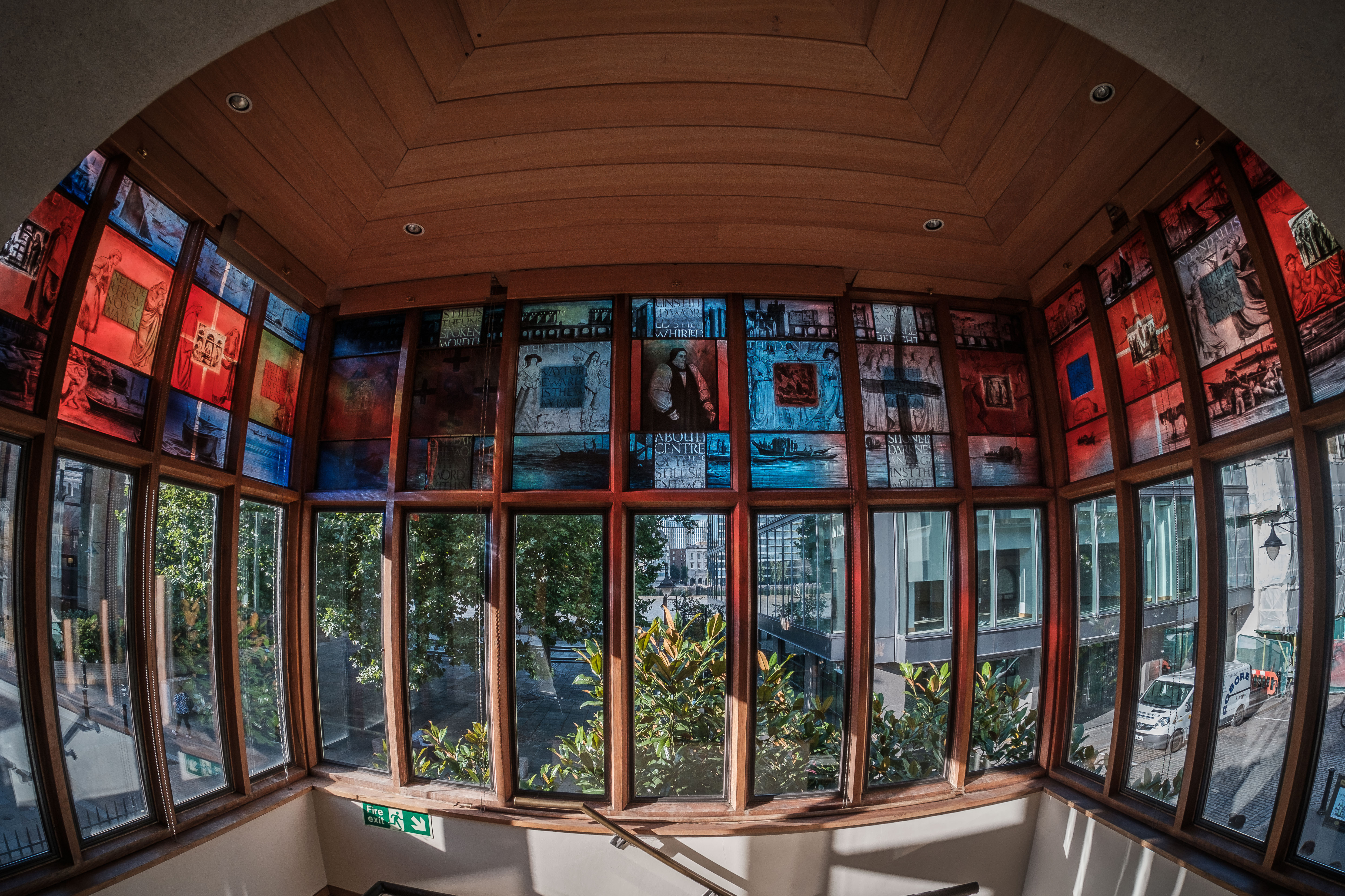 The Library , with dramatic arches inspired by the Gothic architecture in the Cathedral, enjoys natural daylight and a magnificent views of the River Thames. A stained-glass window depicts aspects of the Cathedral's history.